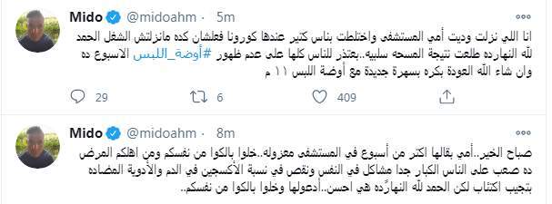 وكتب أحمد حسام ميدو تغريدة علة تويتر " صباح الخير.. أمي بقالها اكتر من أسبوع في المستشفى معزولة.. خلوا بالكوا من نفسكم ومن أهلكم المرض ده صعب على الناس الكبار جدا مشاكل في النفس ونقص في نسبة الأكسجين في الدم والأدوية المضادة بتجيب اكتئاب لكن الحمد لله النهارًده هي أحسن..أدعولها وخلوا بالكوا من نفسكم.."