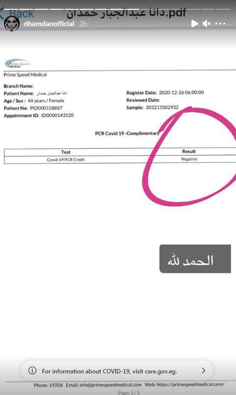 ونشرت دانا حمدان صورة نتيجة المسحة الطبية الخاصة بها، عبر خاصية "الاستوري" على حسابها الشخصي بموقع تبادل الصور والفيديوهات القصيرة "انستجرام"، وعلقت عليها قائلة: "الحمد لله النتيجة سلبية".
