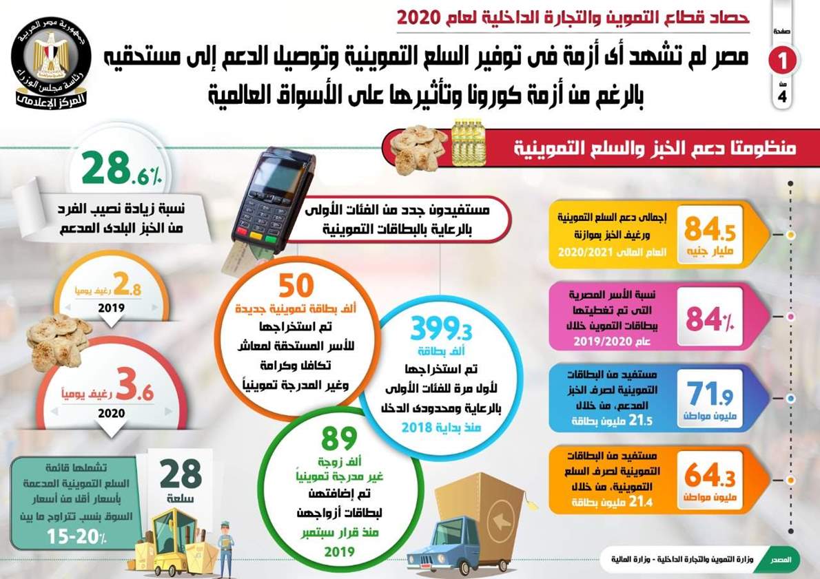 هذا وقد أوضح التقرير أن قائمة السلع التموينية المدعمة تشمل 28 سلعة بأسعار أقل من أسعار السوق بنسب تتراوح ما بين 15% لـ 20%، مشيراً في الوقت نفسه إلى أن نصيب الفرد من الخبز البلدي المدعم زاد بنسبة 28.6%، حيث وصل لـ 3.6 رغيف يومياً عام 2020، مقارنة بـ 2.8 رغيف يومياً عام 2019.