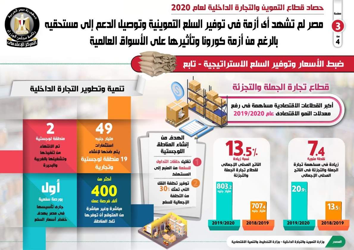 وفي إطار سلسلة متتابعة من التقارير لرصد إنجازات الحكومة في 2020، نشر المركز الإعلامي لمجلس الوزراء، تقريراً تضمن إنفو جرافات تسلط الضوء على حصاد قطاع التموين والتجارة الداخلية لعام 2020.