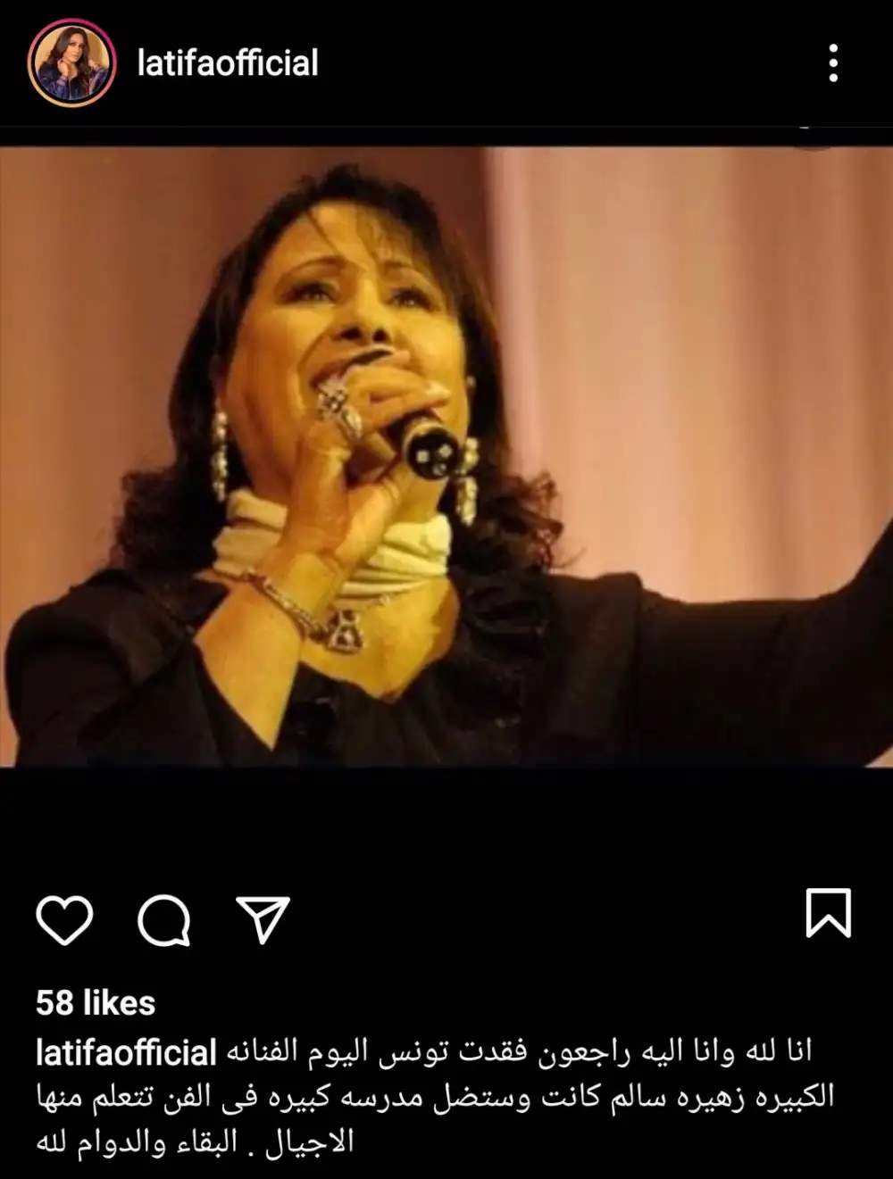 ونشرت الفنانة لطيفة عبر حسابها الشخصي بموقع تبادل الصور والفيديوهات "انستجرام" صورة للفنانة زهيره سالم وعلقت عليها: "إنا لله وإنا إليه راجعون فقدت تونس اليوم الفنانة الكبيرة زهيره سالم، كانت وستظل مدرسة كبيرة في الفن، تتعلم منها الأجيال، البقاء والدوام لله".