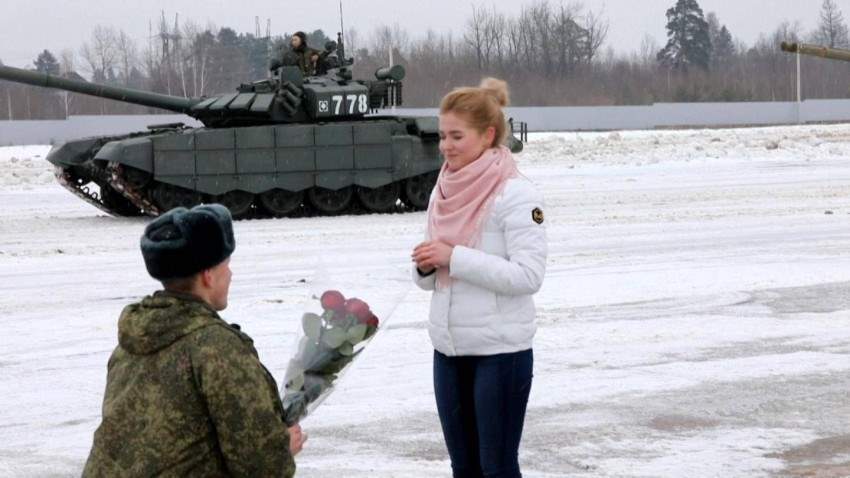 اختار ضابط في الجيش الروسي الاحتفال بعيد الحب بطريقة مميزة، فأحاط نفسه بـ16 مدرّعة من نوع «تي-72 بي 3» اصطفت على شكل قلب، بهدف طلب يد حبيبته للزواج.