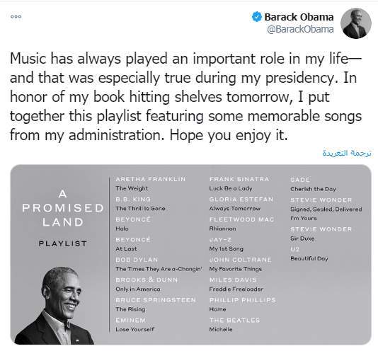 وكتب أوباما، عبر حسابه بموقع تويتر:« لعبت الموسيقى دائمًا دورًا مهمًا في حياتي وكان هذا صحيحًا بشكل خاص خلال فترة رئاستي تكريمًا لكتابي الذي سيصل إلى الرفوف غدًا، أعددت قائمة التشغيل هذه التي تضم بعض الأغاني التي لا تنسى من إدارتي، آمل أن تستمتع به".