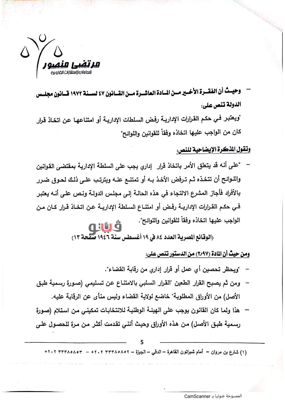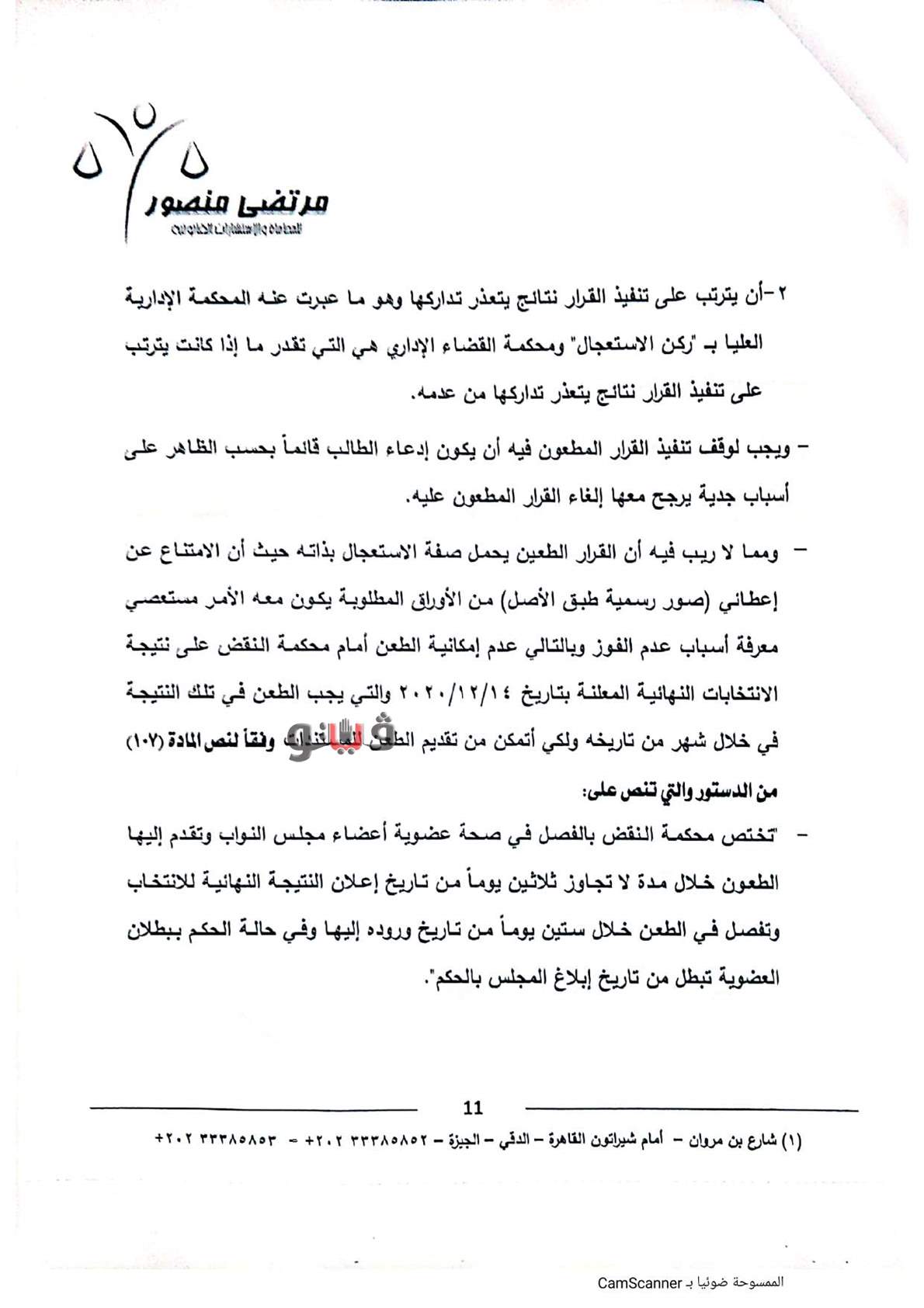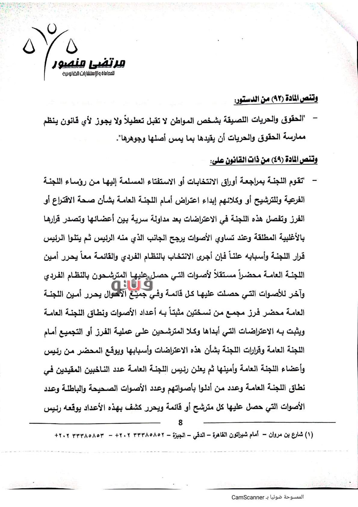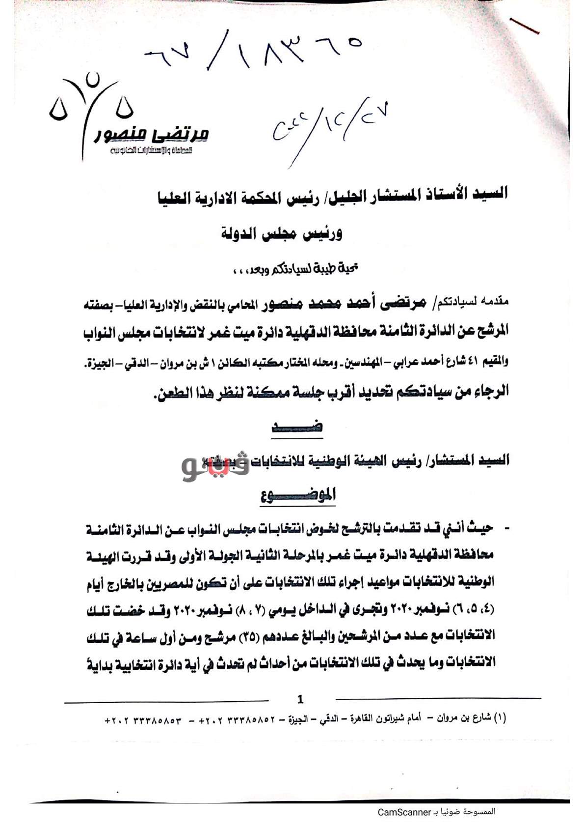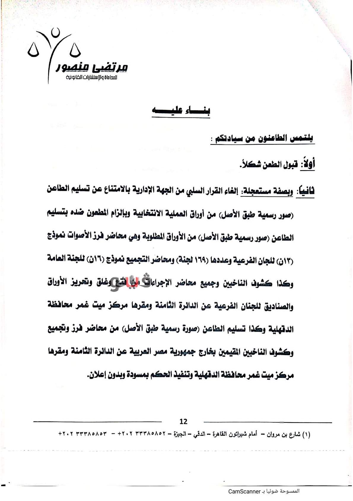 تقدم مرتضى منصور، عضو مجلس النواب السابق، بطعن قضائى امام المحكمة الإدارية العليا بمجلس الدولة ، طالب فيه بإلزام الهيئة الوطنية للانتخابات بتسليمه صور رسمية من اوراق العملية الانتخابية عن الدائرة الثامنة ومقرها مركز ميت غمر بمحافظة الدقهلية .