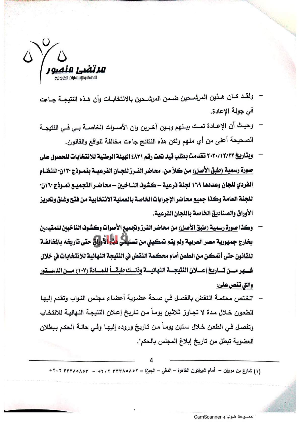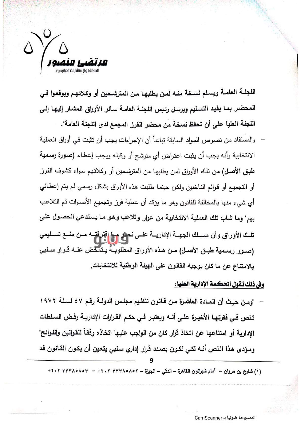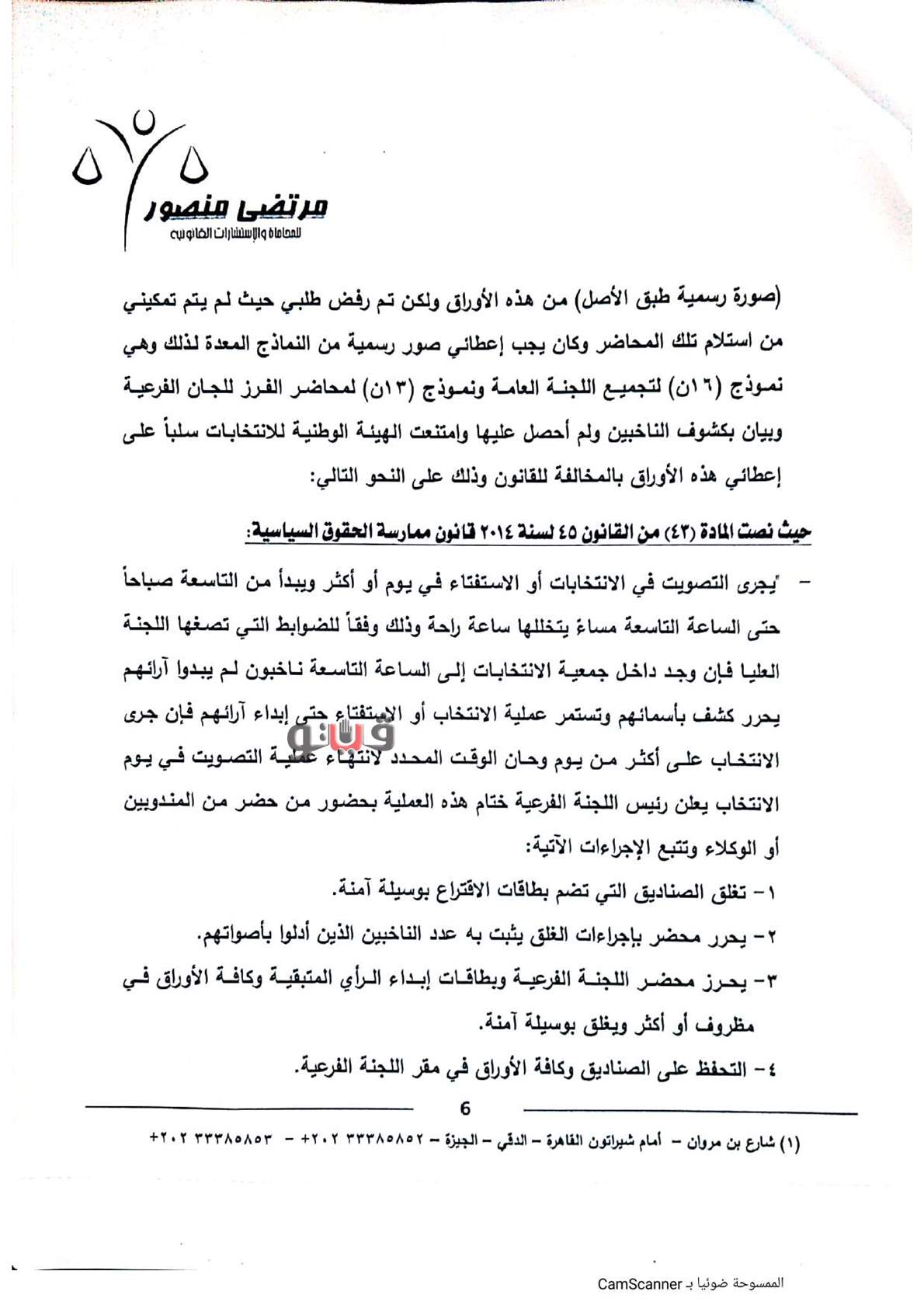 وأشار إلى أنه بعد إعلان النتيجة الرسمية طالبت من الهيئة الوطنية بتسليمى صورة طبق الأصل من محاضر الفرز إلا أنها أمتنعت ورفضت وهو ما حدا بها لتقدبم الطعن .