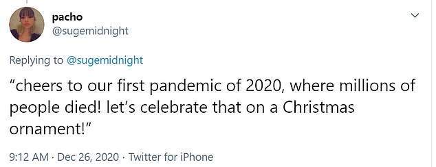 كتب أحد المتابعين، "تحياتنا لأول جائحة لنا في عام 2020، حيث مات ملايين الأشخاص! دعونا نحتفل بذلك في زينة عيد الميلاد!".