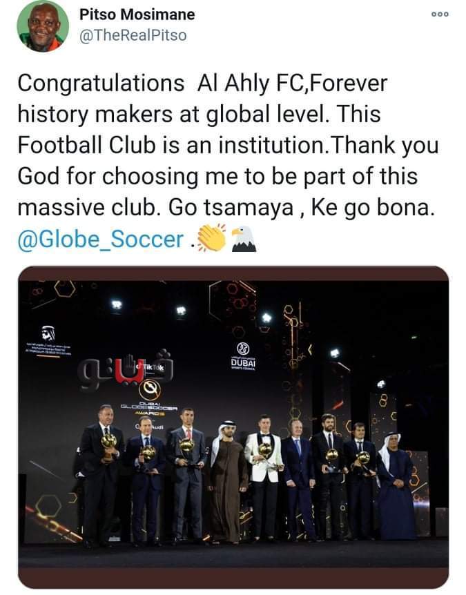 وقال الجنوب إفريقي عبر تويتر:"مبروك للأهلي، يصنع التاريخ دائما على المستوى العالمي. هذا الفريق مؤسسة.".