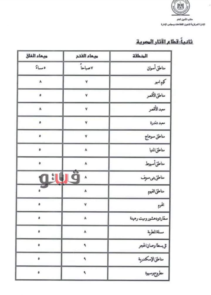 وحددت وزارة السياحة والآثار مواعيد الزيارة بالمواقع والمتاحف الأثرية في محافظة أسوان حيث يتم فتح الزيارة 7 صباحا وحتى 5 مساء، وكوم امبو من 7 صباحا وحتى 8 مساء، ومناطق الأقصر من 7 صباحا وحتى 5 مساء، ومعبد الأقصر من 7 صباحا وحتى 8 مساء ومعبد دندرة من 7 صباحا وحتى 5 مساء.