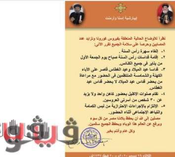 ونوه البيان إلى أن الافتقاد سوق يقتصر فقط على الاتصال التليفوني، ويسمح بإتمام سري المعمودية والميرون بحضور أسرة المعمد فقط (٤ أفراد)، كما تقرر أن تستمر الدراسة في الإكليريكيات والمعاهد والمراكز التعليمية بنسبة حضور ٢٥ ٪، ويلتزم الآباء الكهنة الموقرين والشمامسة وجميع أفراد الشعب باتباع وتطبيق التعليمات الاحترازية بكل دقة.