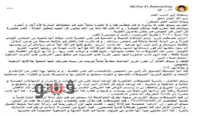 24 ديسمبر ، استغاثت الفنانة نهى العمروسي بالنائب العام، وتقدمت بتظلم على حبس ابنتها "نازلي"، في القضية المعروفة إعلاميًّا باسم "قضية الفيرمونت".