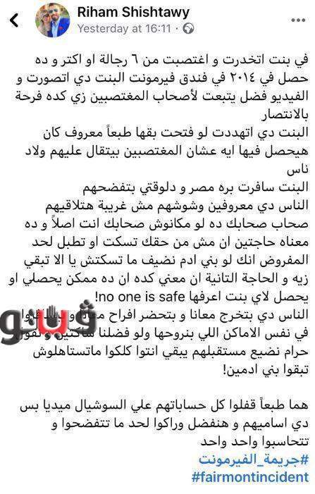 وذكرت النيابة العامة، أنها تلقت كتابًا من «المجلس القومي للمرأة» مرفقًا به شكوى قدمتها إحدى الفتيات إلى المجلس من تعدي بعض الأشخاص عليها جنسيًّا خلال عام 2014 داخل «فندق فيرمونت نايل سيتي» بالقاهرة، ومرفق بشكواها شهادات مقدمة من البعض حول معلوماتهم عن الواقعة وأمر النائب العام بفحص ما قُدّم من أوراق وتحقيق الواقعة تحقيقًا قضائيًّا.