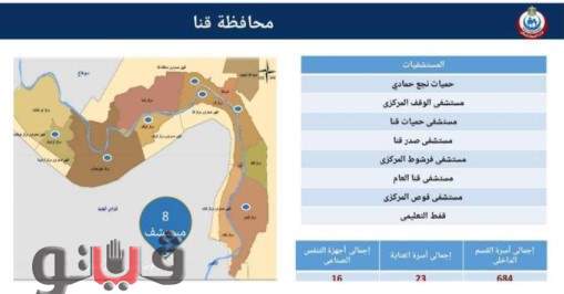 وأوضح الداودي أن المستشفيات الـ 8 التي تم تخصيصها لاستقبال حالات الإصابة بالفيروس هي ( حميات نجع حمادى – الوقف المركزى – حميات قنا – الصدر بقنا – فرشوط المركزى قنا العام – قوص المركزى – قفط التعليمى ) وهى تضم 684 سرير اقامة بالأقسام الداخلية و 23 سرير عناية و 16 جهاز تنفس صناعى لإستقبال وعزل المرضى وتقديم الرعاية الطبية اللازمة وفقا لما تستدعيه حالة المريض.