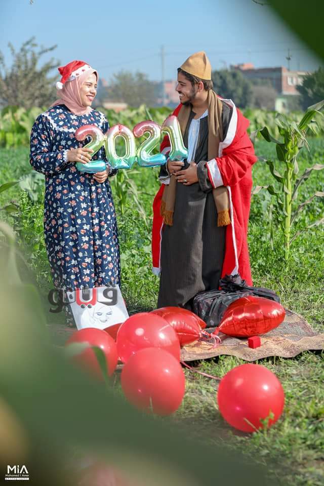 خالد باسطا وخطيبته قررا أن يخضعا لجلسة تصوير مختلفة بحيث تعبر عن زي محافظتهم وفي الوقت نفسه تحمل مظاهر احتفال وتفاؤل ببدء عام جديد ربما يختلف عن سابقيه، حيث قررا الجمع بين الزي الفلاحي وبابا نويل.