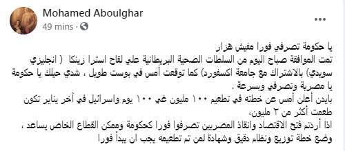 وكتب محمد أبو الغار تدوينة على فيس بوك قال: "يا حكومة تصرفي فورا مفيش هزار تمت الموافقة صباح اليوم من السلطات الصحية البريطانية علي لقاح استرا زينكا ( انجليزي سويدي) بالاشتراك مع جامعة اكسفورد) كما توقعت أمس في بوست طويل، شدي حيلك يا حكومة يا مصرية وتصرفي وبسرعة".