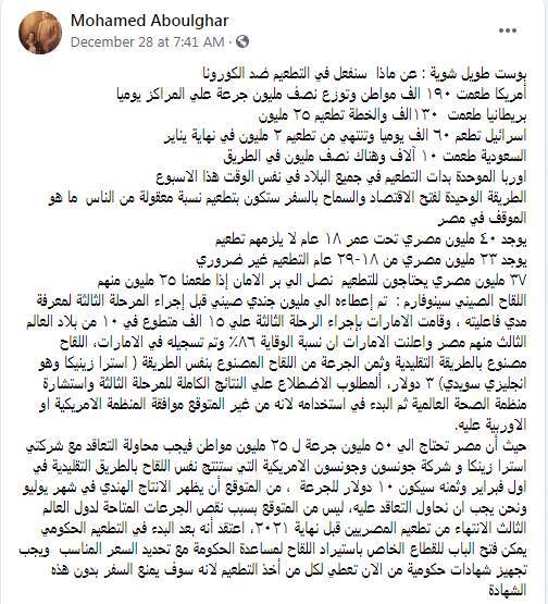 وكان أبو الغار كتب تدوينة سابقة على الفيس بوك قال فيها "أمريكا طعمت ١٩٠ ألف مواطن وتوزع نصف مليون جرعة علي المراكز يوميا، بريطانيا طعمت ١٣٠ألف والخطة تطعيم ٢٥ مليون، وإسرائيل تطعم ٦٠ ألف يوميا وتنتهي من تطعيم ٢ مليون في نهاية يناير، السعودية طعمت ١٠ آلاف وهناك نصف مليون في الطريق، أوروبا الموحدة بدأت التطعيم في جميع البلاد في نفس الوقت هذا الأسبوع".