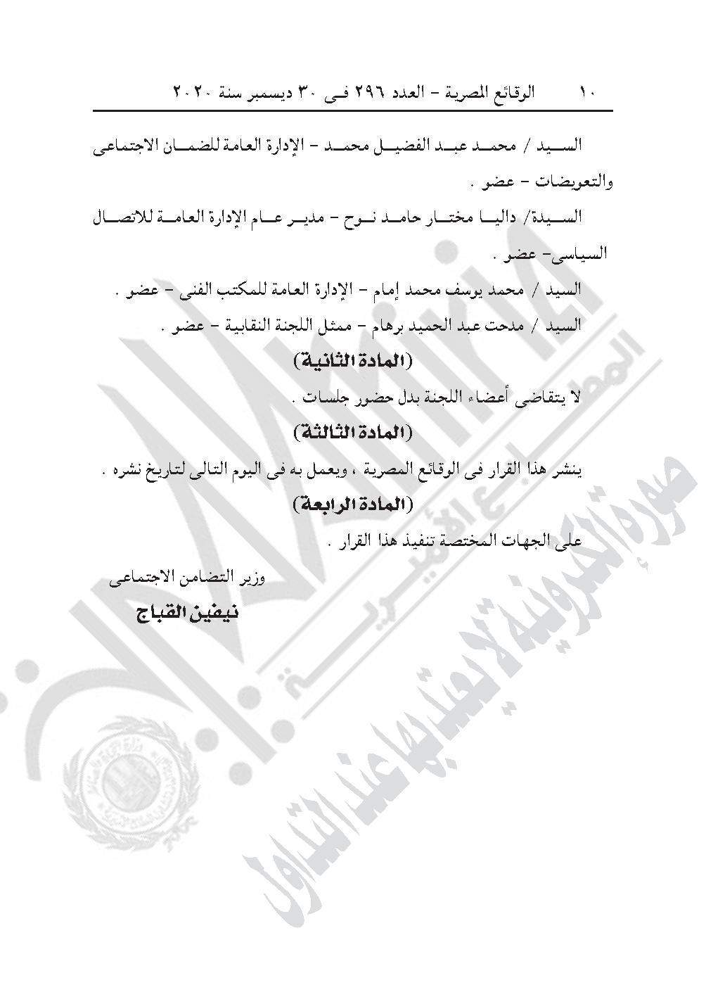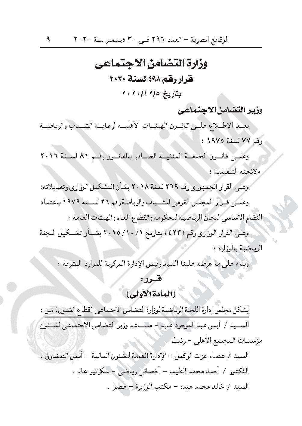 نشرت جريدة الوقائع المصرية في عددها رقم 296، الصادر في 30 ديسمبر 2020، قرار وزارة التضامن الاجتماعي رقم 498 لسنة 2020، بتشكيل مجلس إدارة اللجنة الرياضية لوزارة التضامن الاجتماعي (قطاع الشئون).