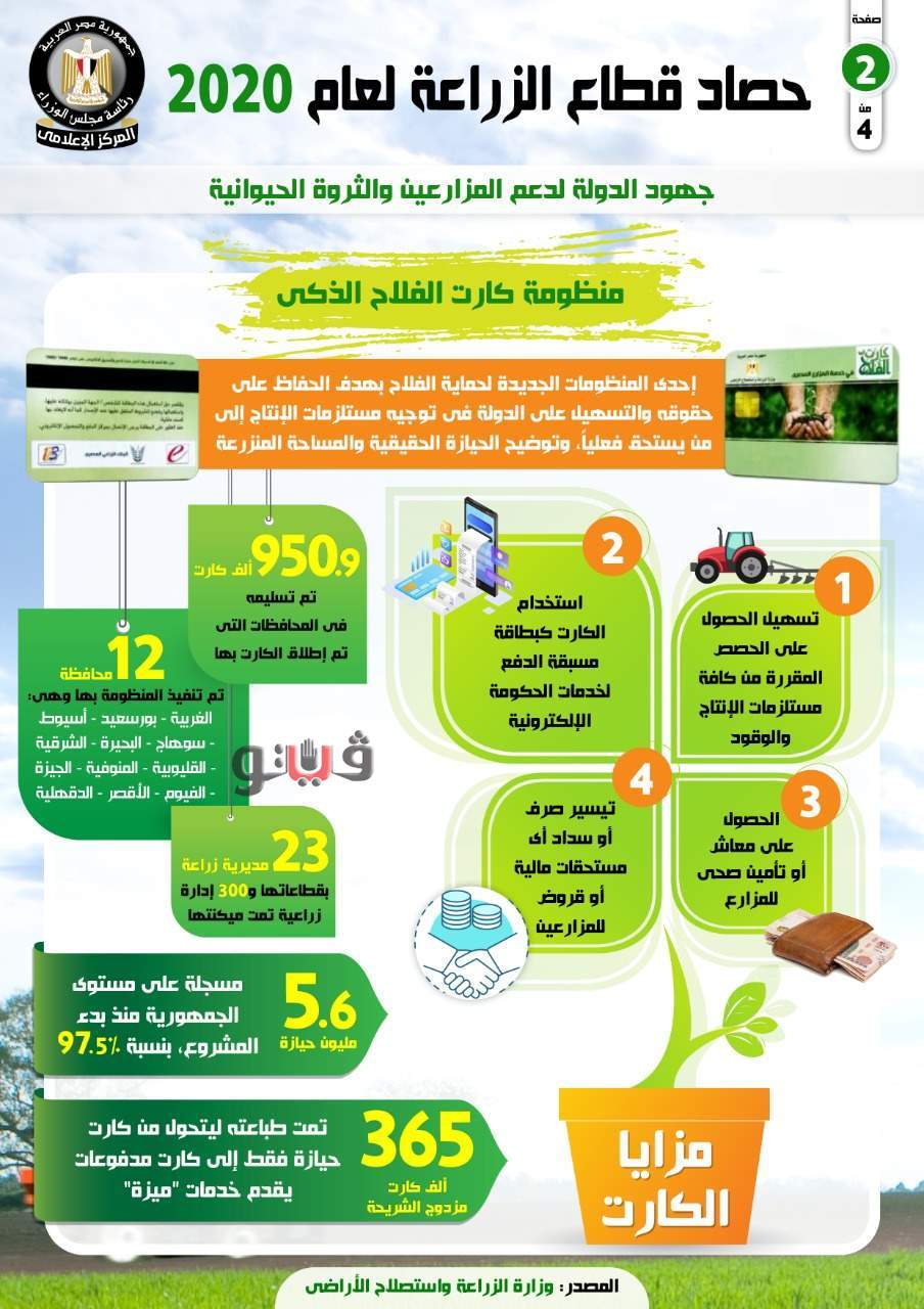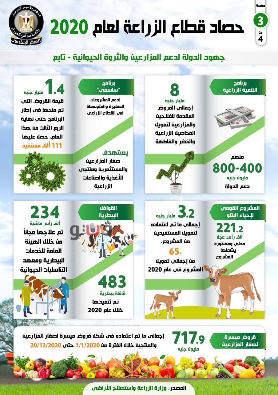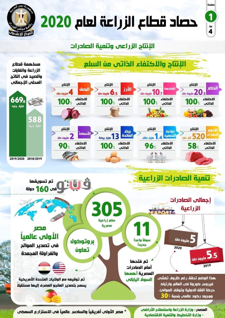 وفي إطار سلسلة متتابعة من التقارير لرصد إنجازات الحكومة في 2020، نشر المركز الإعلامي لمجلس الوزراء، تقريراً في هذا الخصوص، والذي تضمن إنفو جرافات تسلط الضوء على حصاد قطاع الزراعة خلال العام الجاري.