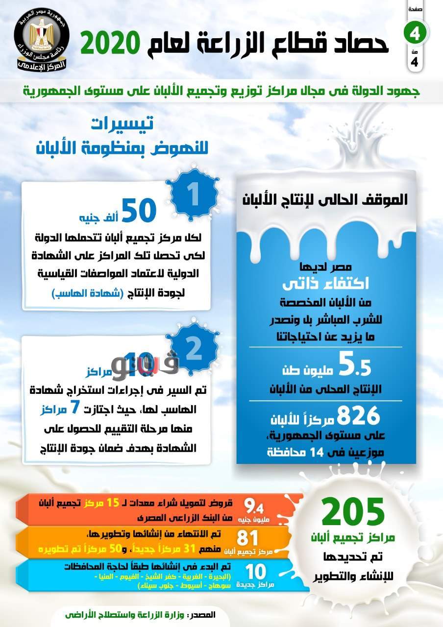 كما تم الانتهاء من إنشاء وتطوير 81 مركز تجميع ألبان منهم 31 مركزاً جديداً، و50 مركزاً تم تطويره، بالإضافة إلى أن هناك 10 مراكز جديدة تم البدء في إنشائها طبقاً لحاجة المحافظات (البحيرة- الغربية- كفر الشيخ- الفيوم- المنيا- سوهاج- أسيوط- جنوب سيناء).