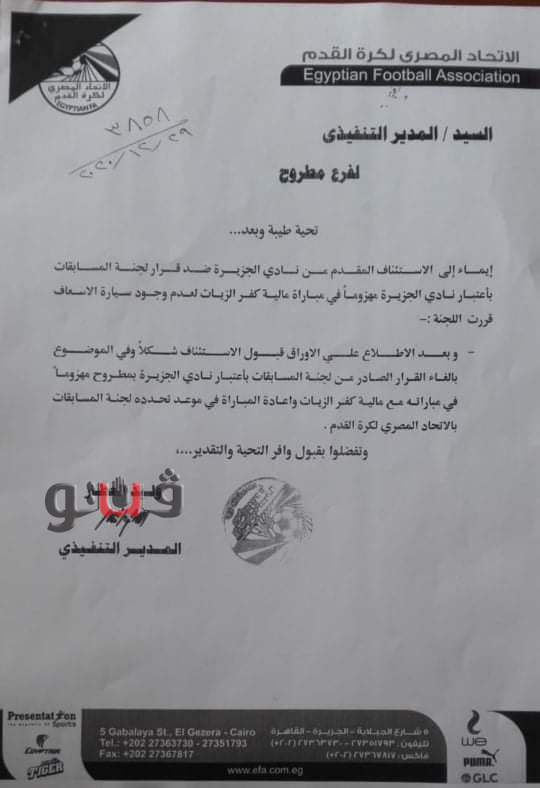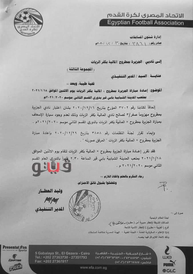 اتحاد الكرة يقرر إعادة مباراة الجزيرة المطروحي ومالية كفر الزيات | مستند