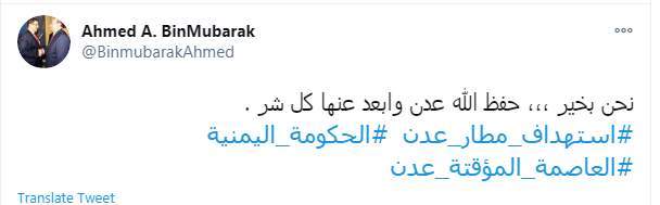 وكتب أحمد بن مبارك تغريدة على "تويتر": "نحن بخير.. حفظ الله عدن وأبعد عنها كل شر.. #استهداف_مطار_عدن #الحكومة_اليمنية #العاصمة_المؤقتة_عدن"..