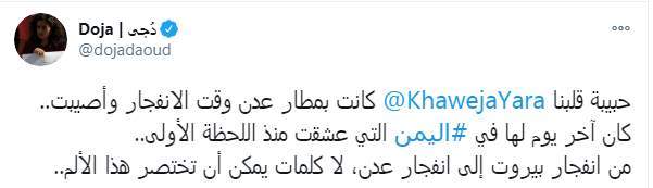 وكتبت دجي تغريدة على تويتر "حبيبة قلبنا يارا خواجة @KhawejaYara كانت بمطار عدن وقت الانفجار وأصيبت.. كان آخر يوم لها في #اليمن التي عشقت منذ اللحظة الأولى."