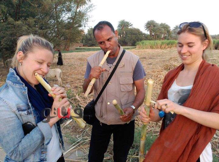 تداول رواد مواقع التواصل الاجتماعي "فيس بوك" صورا لسائحين برفقة مرشد سياحي يتناولون القصب وسط زراعات محافظة الأقصر أثناء استمتاعهم بجولة بشوارع المحافظة.