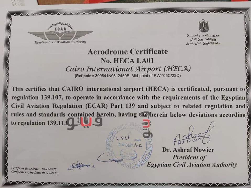 منحت سلطة الطيران المدنى المصرى مطار القاهرة الدولى، شهادة الترخيص للعمل كمطار دولى لمدة 3 أعوام.