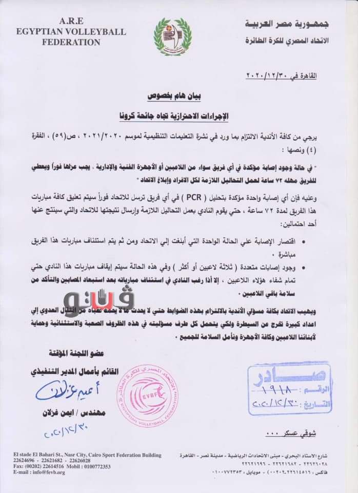 وتضمن قرار الاتحاد أنه خلال فترة تعليق المباريات يتم إجراء مسحات لباقي عناصر الفريق ويتم إخطار لجنة المسابقات بنتيجتها لاتخاذ قرار نهائي بشأن موقف الفريق.
