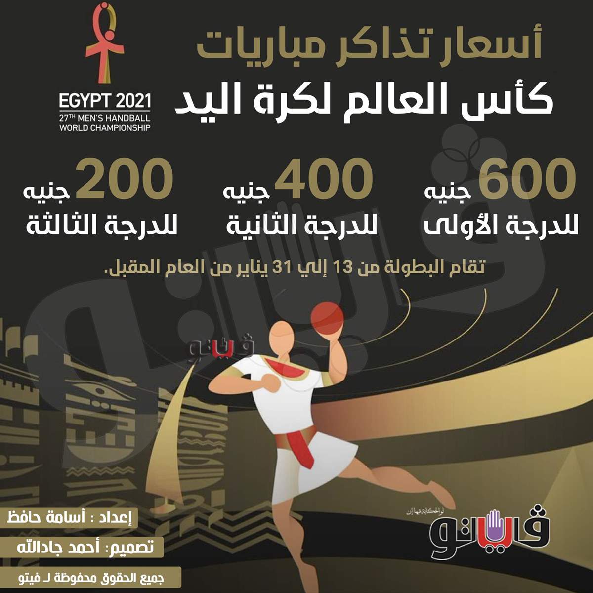 أسعار تذاكر مباريات كأس العالم لكرة اليد..إنفوجراف الجمعة 01/يناير/2021 - 02:22 م 1/1/2021 2:22:22 PM مونديال اليد أسامة حافظ شارك طباعة 18 حجم الخط شارك طباعة كأس العالم مونديال اليد أسعار تذاكر كأس العالم لكرة القدم