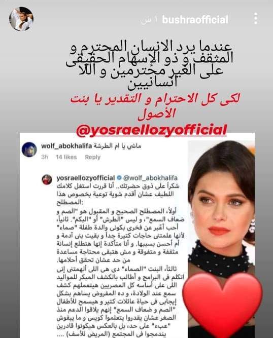يسرا اللوزي أضافت "شكرا على ذوق حضرتك، أنا قررت استغل كلامك اللطيف عشان أقدم شوية توعية بخصوص هذا المصطلح، أولا المصطلح الصحيح والمقبول هو الصم وضعاف السمع وليس الطرش أو البكم، ثانيا أحب أعبر عن فخرى بكونى والدة طفلة صماء، لأنها علمتنى حاجات كتيرة جدا وبقيت بنى آدمة وأم أحسن بسببها، وأنا متأكدة إنها هتطلع إنسانة مثقفة ومتفوقة ومش هتبقى محتاجة مساعدة من حد عشان تحقق أحلامها".