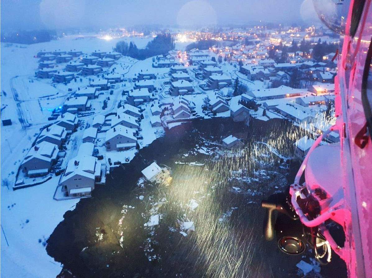 وضرب الانهيار الأرضي منطقة سكنية في بلدية جيردروم، التي تبعد نحو 30 كيلومترا شمالي العاصمة أوسلو.