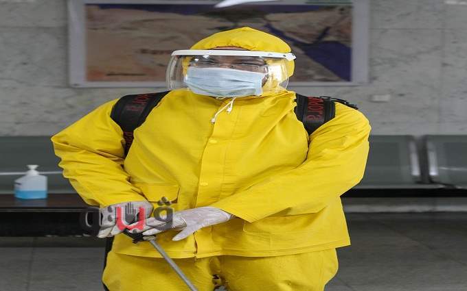 أحد عمال التعقيم أثناء القيام بتعقيم بنك الدم بالعجوزة