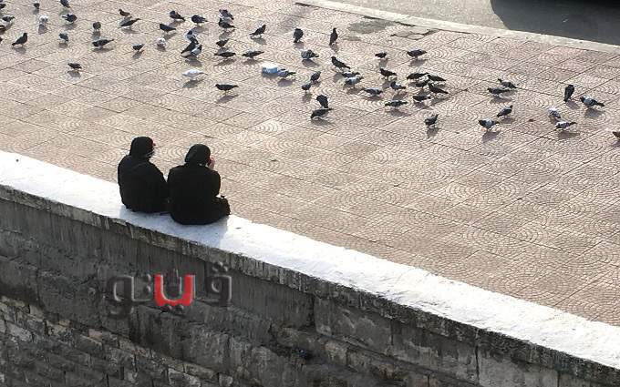 اثنان من سكان حي الزمالك يتنزهان على كورنيش الزمالك، ويشاركان في تقديم الأكل الحمام المتواجد أمامهما