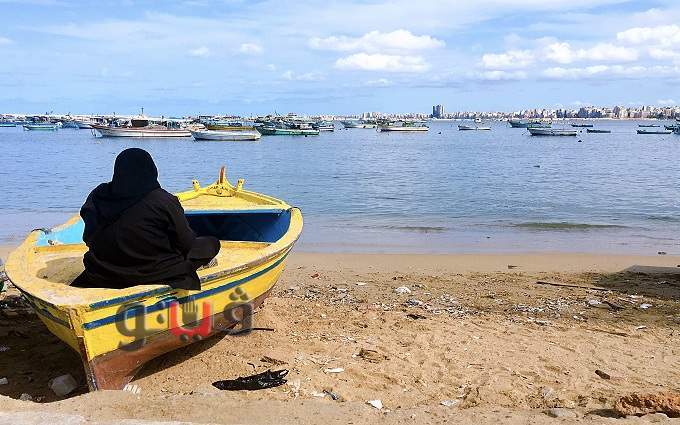 سيدة تجلس على أحد مراكب الصيد وتستمتع بالنظر إلى المياه في أحد شواطئ الإسكندرية