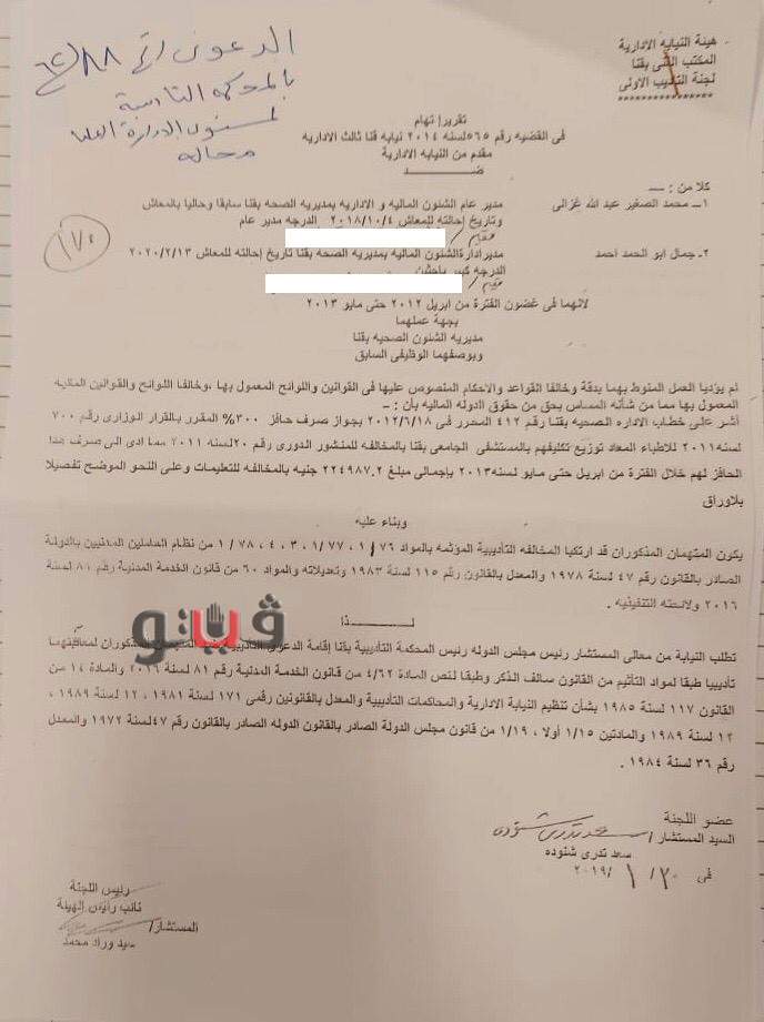 وتبين أن المحالين قاما بالتأشير على خطاب الإدارة الصحية بقنا بجواز صرف حافز 300% المقرر بالقرار الوزاري رقم 700 لسنة 2011 للأطباء المعاد توزيع تكليفهم بالمستشفى الجامعي بقنا بالمخالفة للمنشور رقم 20 لسنة 2011 مما أدى إلى صرف هذا الحافز لهم بإجمالي مبلغ 225 الف جنيه بالمخالفة للتعليمات.