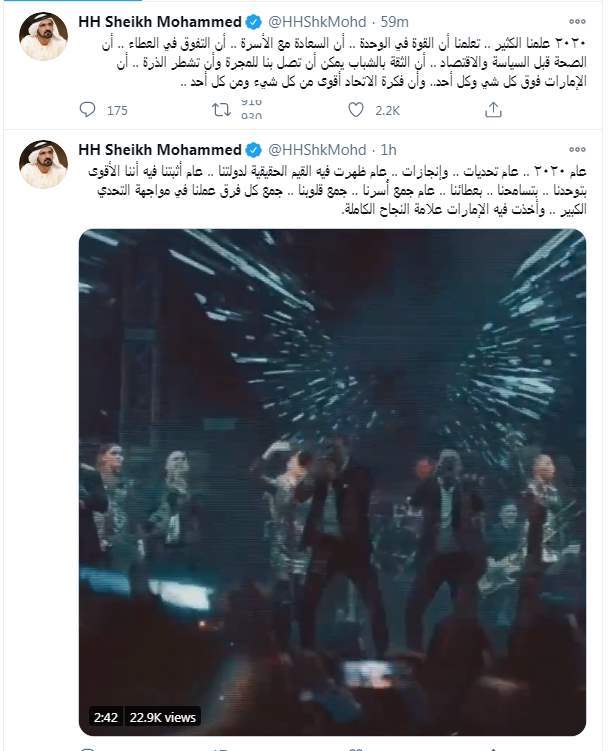عام ٢٠٢٠ .. عام تحديات .. وإنجازات .. عام ظهرت فيه القيم الحقيقية لدولتنا .. عام أثبتنا فيه أننا الأقوى بتوحدنا .. بتسامحنا .. بعطائنا .. عام جمع أُسرنا .. جمع قلوبنا .. جمع كل فرق عملنا في مواجهة التحدي الكبير .. وأخذت فيه الإمارات علامة النجاح الكاملة.— HH Sheikh Mohammed (@HHShkMohd) December 31, 2020