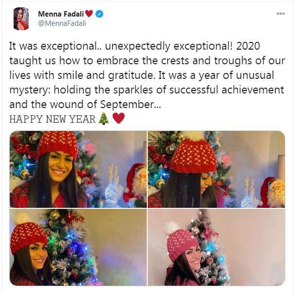 "كانت استثنائية.. استثنائية بشكل غير متوقع! علمنا عام 2020 كيفية احتضان قمم وقيعان حياتنا بابتسامة وامتنان. كانت عام الغموض غير العادي: حمل بريق الإنجاز الناجح وجرح سبتمبر.. عام جديد سعيد".