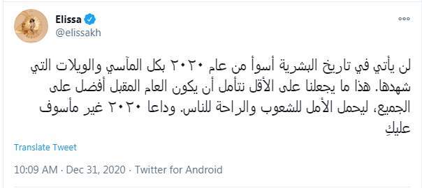 وكتبت إليسا قائلة: "لن يأتي في تاريخ البشرية أسوأ من عام ٢٠٢٠ بكل المآسي والويلات التي شهدها. هذا ما يجعلنا على الأقل نتأمل أن يكون العام المقبل أفضل على الجميع، ليحمل الأمل للشعوب والراحة للناس. وداعا ٢٠٢٠ غير مأسوف عليكِ".