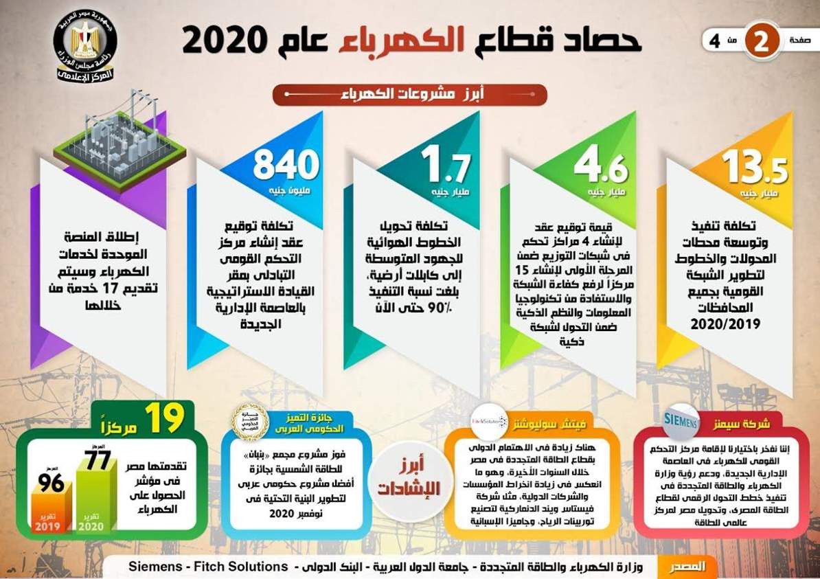 وفي إطار سلسلة متتابعة من التقارير لرصد إنجازات الحكومة في 2020، نشر المركز الإعلامي لمجلس الوزراء، تقريراً تضمن إنفو جرافات تسلط الضوء على حصاد قطاع الكهرباء في هذا العام.