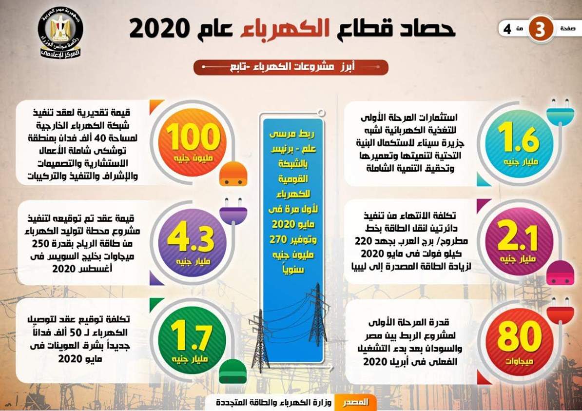 وأوضح التقرير أنه تم ربط مرسى علم- برنيس بالشبكة القومية للكهرباء لأول مرة، ما سيساهم في توفير 270 مليون جنيه سنوياً، بالإضافة إلى توقيع عقد بقيمة 1.7 مليار جنيه لتوصيل الكهرباء لـ 50 ألف فدان جديدة بشرق العوينات، وذلك في مايو 2020.