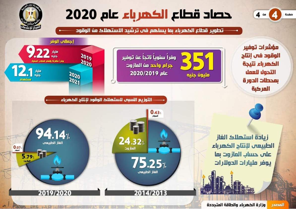 وجاء في التقرير أن تطوير قطاع الكهرباء ساهم في ترشيد الاستهلاك من الوقود، مستعرضاً مؤشرات توفير الوقود في إنتاج الكهرباء نتيجة التحول للعمل بمحطات الدورة المركبة، حيث وصل الوفر السنوي الناتج عن توفير جرام واحد من المازوت إلى 351 مليون جنيه، بإجمالي وفر بلغ 9.22 مليار جنيه عام 2019/2020، مقارنة بالعام المالي السابق، ومن المستهدف أن يصل إجمالي الوفر لـ 12.1 مليار جنيه خلال عام 2020/2021.