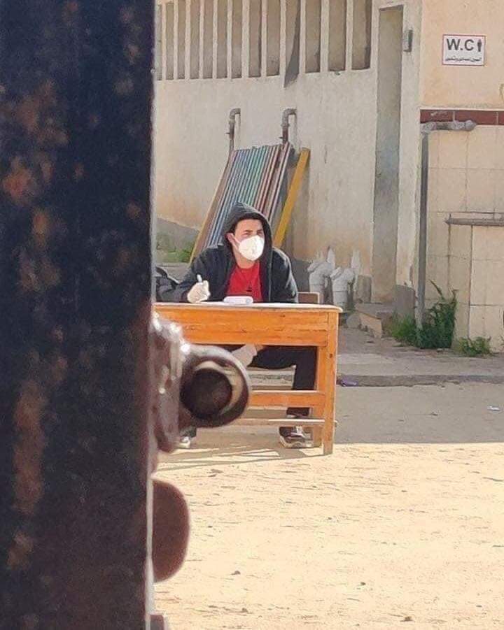تداول عدد من نشطاء موقع التواصل الاجتماعي فيس بوك، عدد من الصور لإحدى طلاب الصف الأول الثانوي بمدرسة نجيب محفوظ التجريبية لغات بإدارة شرق محافظة الإسكندرية، خلال أداء الامتحان العملي على الرغم من إبلاغ إدارة المدرسة بأنه مصاب بفيروس كورونا.