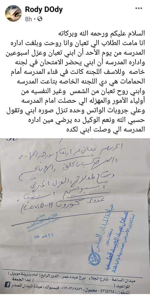 وروت ولية أمر الطالب المصاب بفيروس كورونا، أنها قامت بإبلاغ إدارة المدرسة بإصابة أبنها فيروس كورونا وأنه تم عزله لمدة أسبوعين، ولكن إدارة المدرسة طالبت ولي الأمر بإحضار الطالب للامتحان أو جواب وعرض الطالب علي التأمين الصحي، وأنه سوف يتم عقد امتحان الطالب داخل لجنة خاصة.