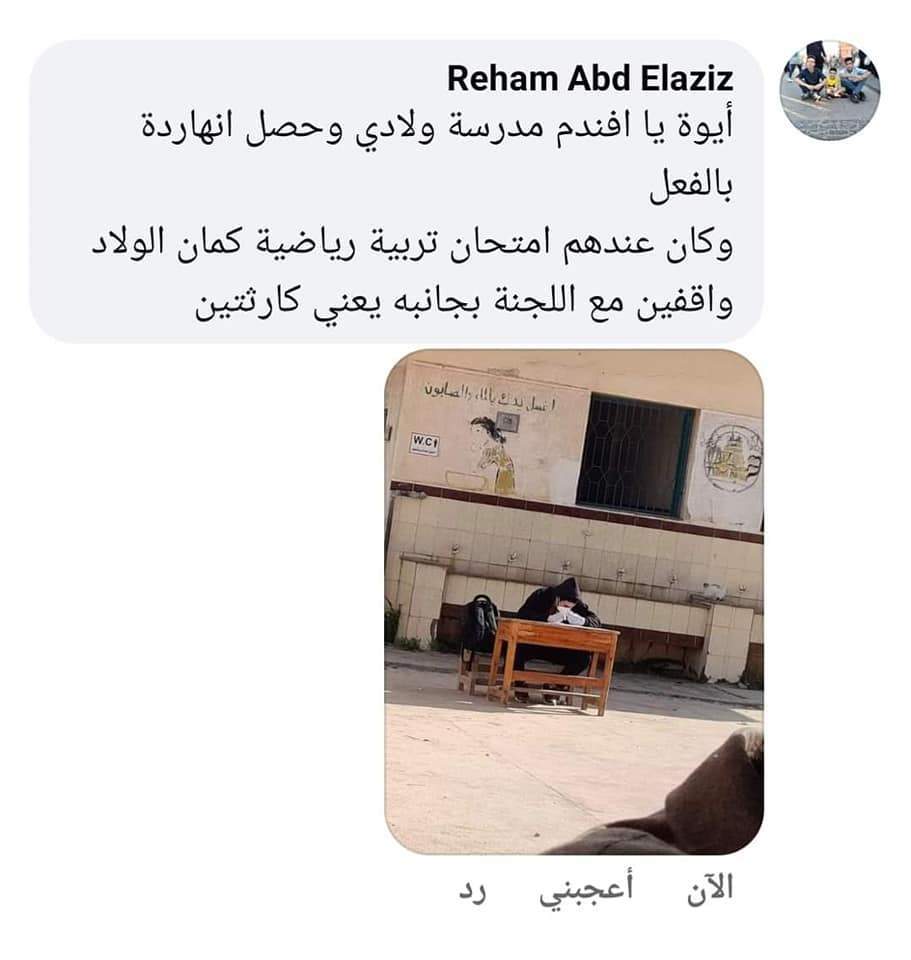 وقال أولياء الأمور أن الطالب تم عقد امتحانه بلجنة خاصة بحوش المدرسة بجانب دورات المياه المخصصة للبنات، وسادت حالة من الغضب بين عدد كبير من أولياء الأمور جراء هذا المنظر.