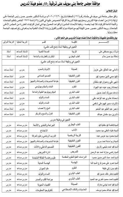 بني سويف برئاسة الدكتور منصور حسن رئيس الجامعة، على ترقية 45 من أعضاء هيئة