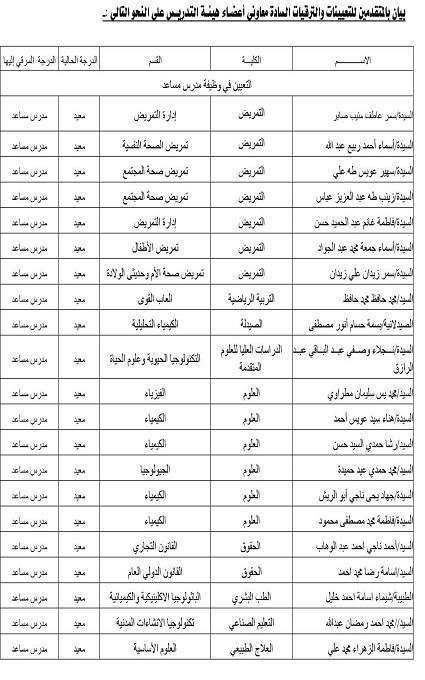 بيان بالمتقدمين للتعيينات والترقيات السادة أعضـاء هيئـة التدريـس علي النحو التالي: