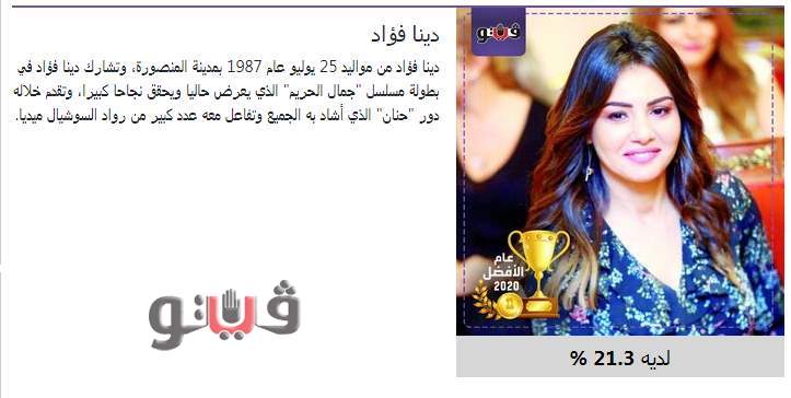 فازت النجمة "دينا فؤاد" بلقب أفضل ممثلة فى استفتاء "فيتو" لاختيار الأفضل فى عام 2020 بعد منافسة مع عدد من الفنانات.