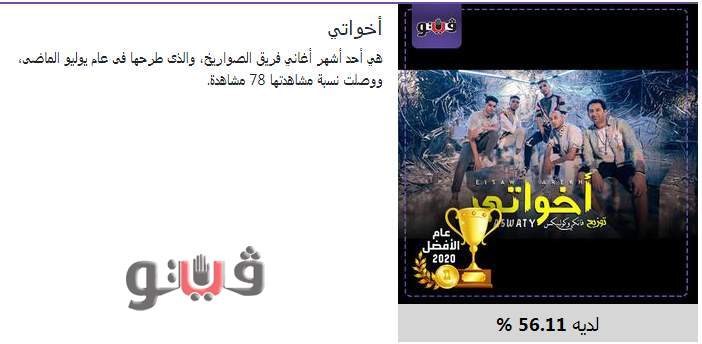"أخواتى" أشهر أغاني فريق الصواريخ بلقب أفضل مهرجان فى استفتاء "فيتو" لاختيار الأفضل في عام 2020.