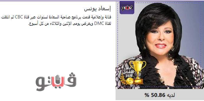 وحصلت"إسعاد يونس على نسبة 50.86%، من أصوات الجمهور، تليها منى الشاذلي بنسبة 33.33%، ووفاء الكيلانى 5.9%، وإيمان الحصري 4.19%، ولبنى عسل 3.24%، ولميس الحديدي 1.9%.