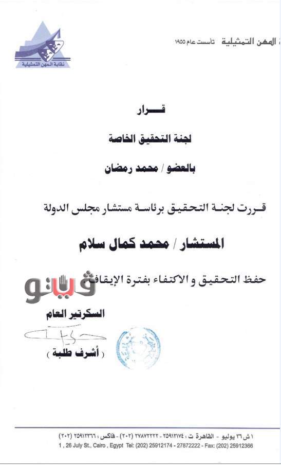 كما حصلت فيتو على نص القرار الذي صدر برئاسة المستشار محمد كمال سلام مستشار مجلس الدولة، والذي جاء فيه " حفظ التحقيق مع الفنان المذكور في ازمة اتهامه بالتطبيع والاكتفاء بفترة الإيقاف السابقة".